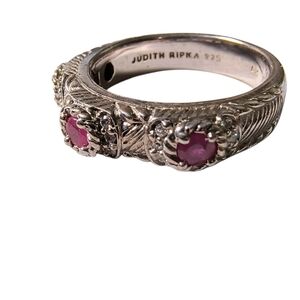 Three small rubies are set along the ornately embellished band of this stylish Judith Ripka ring. Each ruby has 6 small CZs as accent stones to add both sparkle and texture. The band has a uniform 3/16 inch height all the way around making it perfect worn alone or stacked with other favorites.
