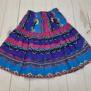 Very cute vintage Wagon Wheels circle skirt! Elastic waist with a tiered and slightly flared hem. Skirt has been gently worn, just has a spot with a few popped stitches (Its double stitched so there is no hole). Size medium, doesn't say juniors but it does run small. Would fit a size XS best but waist does stretch a few inches.