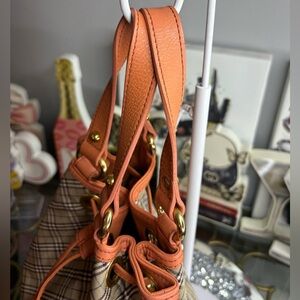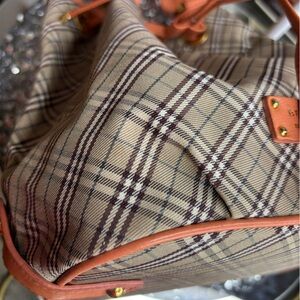 Design: The bag features the signature Burberry Nova Check plaid pattern on a canvas body with orange leather handles and trim.