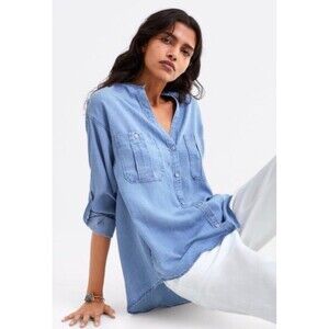 ZARA Lt Wash Chambray V-neck Chest Pockets Tab Sleeves Top Blouse M