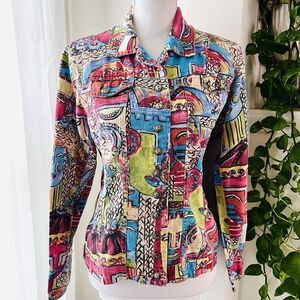 Chico's Colorful Abstract Faces Wearable Art Denim Jacket - Size 1 (Medium Sz 8)