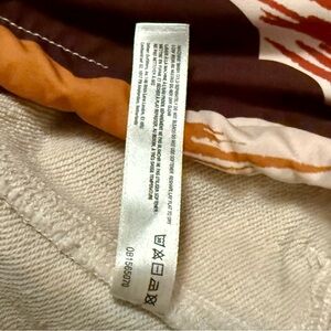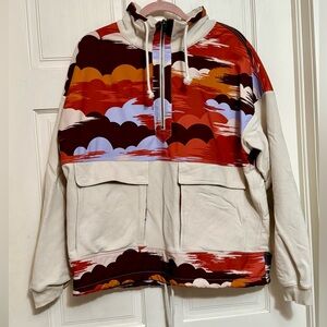 Stylish hoodie with a vibrant abstract pattern. Features a mix of red, orange, and cream colors and cute front pockets.
