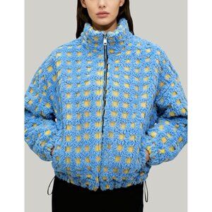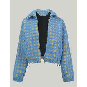 Women Blue Cropped Sherpa Fleece Plaid Jacket Chunky Outerwear