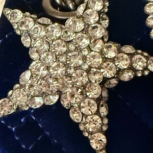 This stunning Kurt Geiger crossbody blue velvet bag features dazzling crystal star and oval embellishments, perfect for adding a touch of glamour to any outfit. The elegant design is complemented by a chic chain strap, making it a versatile accessory for both day and night.