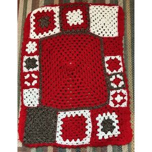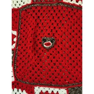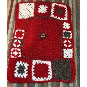 VTG Handmade Red White Brown Crochet Granny Square Sock Monkey Face Kids Afghan