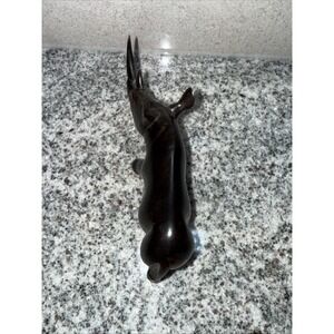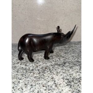 This vintage figurine is a 6-inch carved ebony wood rhino, handmade in the Central African Republic. Featuring intricate details, this unique piece is a collectible item that showcases the beauty and strength of rhinoceros. The craftsmanship and materials used in this figurine make it a special addition to any collection, particularly for those interested in wild animals and animal figurines. No chip or cracks
