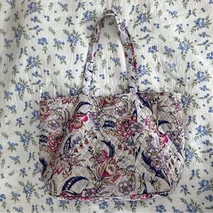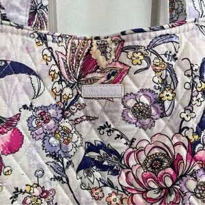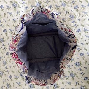 Elegant tote with a pastel floral design. Features shades of pink, purple, and blue. Perfect for everyday use.