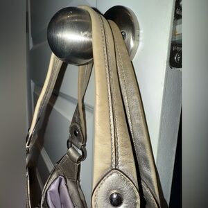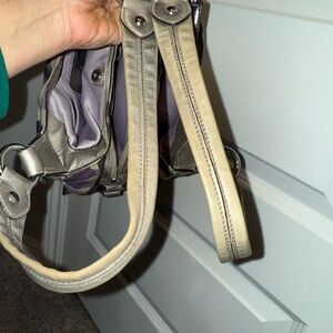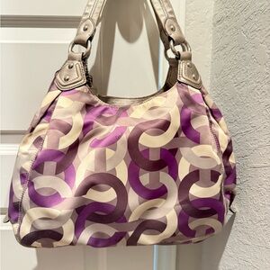 Stylish Coach shoulder bag with a lavender, light gray, dark gray and cream pattern with silver accents. Perfect for any occasion!