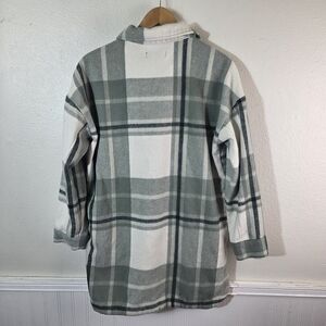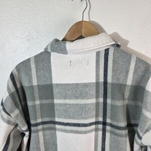 Versatile and cozy Banana Republic plaid shacket, perfect for layering in cooler weather. Soft fleece fabric offers warmth with the look of a classic button-up.