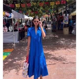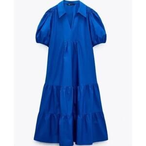 Zara Cotton Poplin Midi Dress Medium Cobalt Royal Blue Collared Tiered Preppy