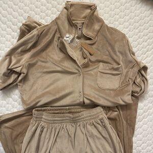 Brand new Skims soft tan velour set with button down top and long pants. Pants are loose at the bottom (not joggers). Both XS.