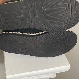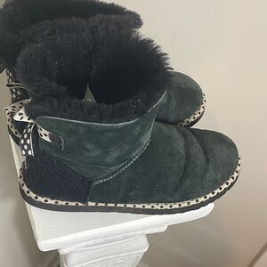 Stylish UGG ankle boots. Black suede exterior. Cozy fur lining. Perfect for cold weather.