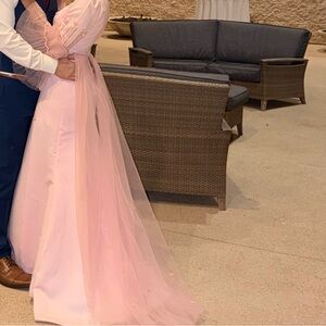 Step into elegance with this stunning baby pink evening gown. Perfect for special occasions, this dress features delicate details and a flattering silhouette.