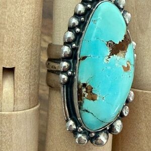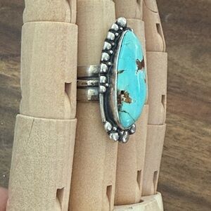 Stunning turquoise ring set in silver, ideal for enhancing any ensemble. Handmade by Etsy artist Sterling To Love, artist stamped, sterling silver stamped, natural turquoise stone set in sterling silver, ring size 7, good condition