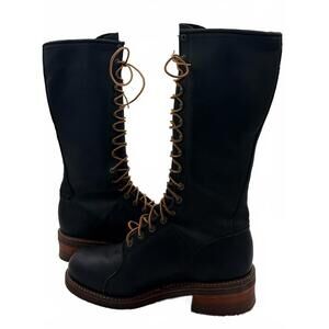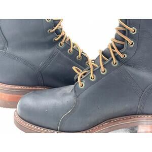 Here is a pair of 18 eyelet extra tall Hall's Lineman / Logging / Motorcycle boots in Men's size 12E. These are absolutely beautiful boots. These appear to be lightly used, and have brand new smooth soles -- if they were previously worn, they were not worn with these soles. They are in overall decent condition, and there is a little bit of oxidation by each eyelet -- the thing about these is that they can be resoled, reconditioned, eyelets can be replaced, and these boots can seriously last a lifetime. The more they are worn the more comfortable they get and the more character they have. Whether you need a pair of heavy duty workboots, a sturdy pair of ridng boots, or just enjoy wearing boots in general, these are seriously awesome!