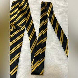 Pre owned. Good condition. Signs of use shown in pictures. Add a touch of sophistication with this elegant black and gold striped tie. Perfect for formal events.