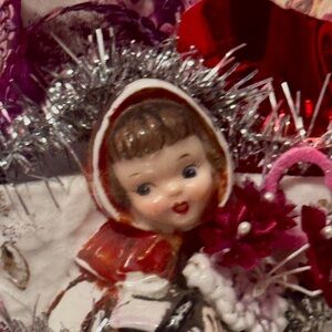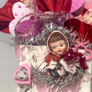Charming vintage ceramic figurine with Valentine theme. Features a child in red and pink attire, surrounded by silver tinsel and heart decorations. Perfect for holiday decor. It’s Red Ridinghood and you can see the little grey Wolfe peeking through a pink Valentine… trying to hide!!