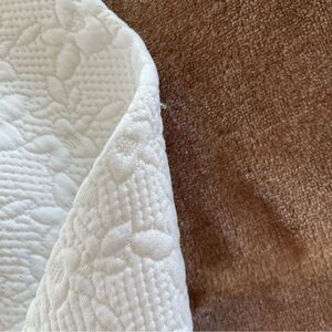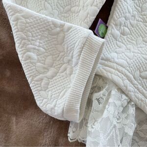Elegant white quilted sweater with red floral detail. Features a charming lace hem. Ideal for special moments. The fabric is quite thick so great for festive occasions during the winter. There is some light pilling which is not very noticeable due to the white fabric. Please see close up details to show how little it affects the fabric! Let me know if you have any questions.