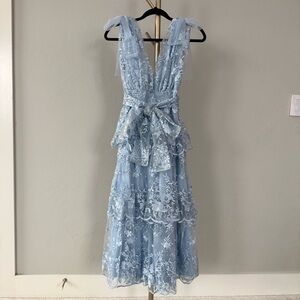 Charming light blue midi dress with floral lace. Features tiered layers and delicate bow straps. Ideal for elegant events.