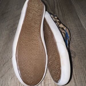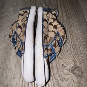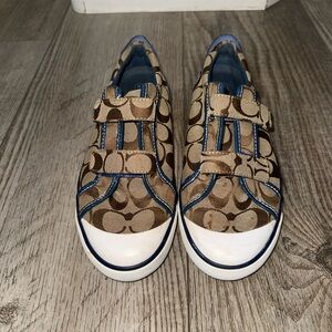Coach Barrett Canvas logo sneakers brown blue patent leather trim 8 EUC Velcro