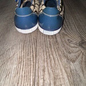 Coach Barrett signature canvas sneakers with blue patent leather trim and two velcro hook-and-loop straps. This specific style appears to be a vintage or retired model, often found on resale sites.
