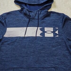 Men's Under Armour ColdGear hoodie sweatshirt, loose fit. Navy blue heathered, white UA graphic design across chest,