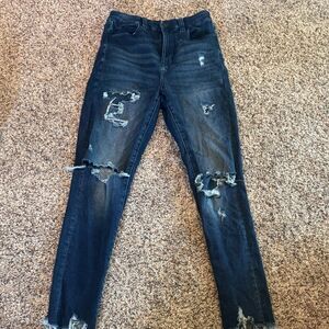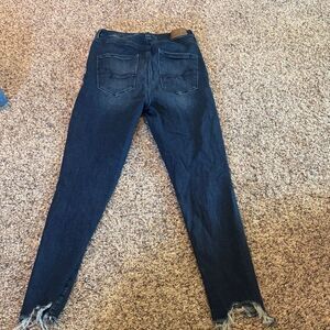 AE “next level stretch” curvy high rise jegging skinny jeans offer a contemporary look with their distressed detailing and medium wash. The jeans feature a full-length design with strategic tears and fraying for a casual, lived-in appearance. 29 inch inseam, size 2 (short) with skinny ankle fit