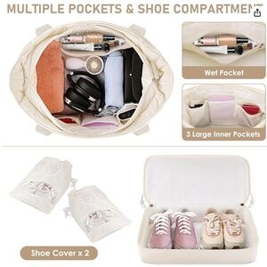 Brand new with tags, ETRONIK Gym Bag for Women, Yoga Mat Bag with Water Bottle Bag, 40L Weekender Overnight Bag with Shoe Compartment & Wet Pocket, Travel Duffle Bag Women for Yoga, Work, Hospital, Pilates and Gym, Beige. It's this beige/cream color, slightly yellow IRL.