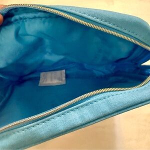 Estée Lauder limited edition cosmetic bag from a collaboration with British artist and designer Amber Locke. The design features a vibrant blue background with a printed square panel showcasing a colorful floral and cucumber pattern.