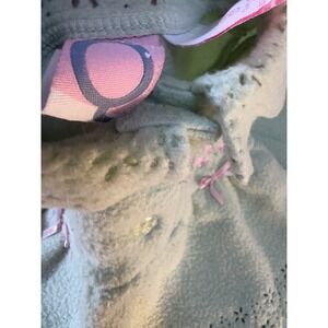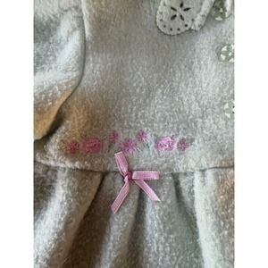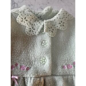 Wrap your little one in whimsical charm with this adorable mint green fleece coat. Delicate pink floral embroidery and sweet little pink bows adorn the bodice, adding a touch of playful elegance. The charming eyelet-style scalloped collar and hem create a delicate, vintage-inspired silhouette. This cozy coat is perfect for keeping your baby girl snug
