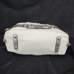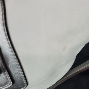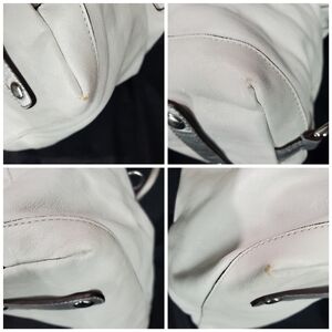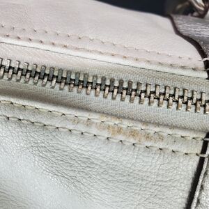 Exterior: Zip top closure, silvertone hardware, does have a little wear spot on the top, and on back right see photo