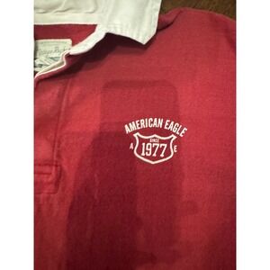 Keywords: American Eagle, Rugby Shirt, Long Sleeve, Striped Sleeves, Collared Shirt, Casual Wear, Preppy Style, Vintage Inspired, Athletic Style, Comfortable, Everyday Essential, Campus Style