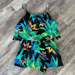 Brighten up your wardrobe with this vibrant tropical print romper. Featuring a colorful design with shades of green, blue, and yellow, it's perfect for sunny days.