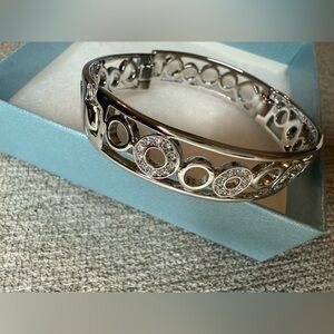 This elegant silver bracelet adds a touch of sophistication to any outfit. Perfect for any occasion.