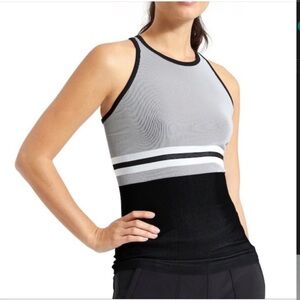 Chic tank top with a sleek gray and black design. Ideal for active wear. Athleta renew Racer back tank is form fitting athletic style top, black and white striped upper section solid lower section sleeveless