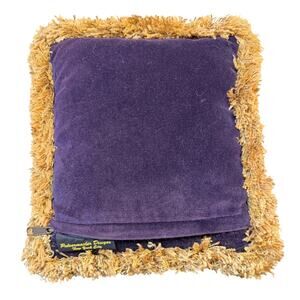 Beautiful Pulvermacher Designs New York City Christmas pillow featuring a classic Santa-at-work scene framed with ornate trim and thick golden fringe. The back is a rich purple velvet with a zipper closure, allowing the insert to be removed.
