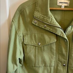 Stay stylish with the olive green jacket. Perfect for any occasion, this jacket offers both comfort and elegance. Crop length, waist can be sinched.