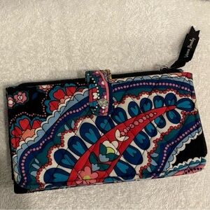This vibrant Vera Bradley women's wallet features a stunning floral design in blue, pink, and black. Perfect for adding a pop of color to your accessories collection.