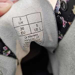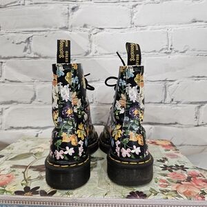 The 1460 Pascal boots from Dr. Martens are an 8-eye lace-up boot. They have the signature rubber lug sole. They are blaxk with a floral print. They are in great used condition.