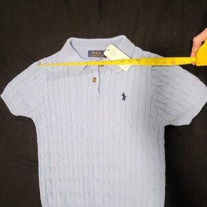 Beautiful sky blue cable knit polo by Ralph Lauren. New with tags, no flaws. The colour is best represented by the first photo, although the colour isn't as pale in real life