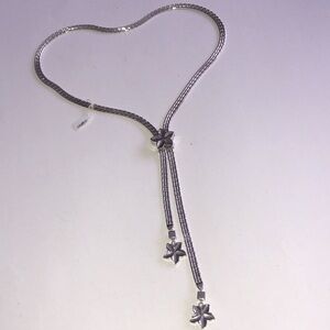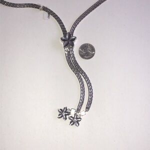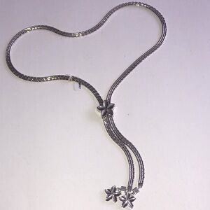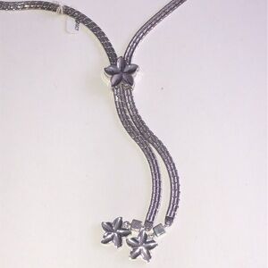 This elegant silver necklace features a beautiful floral design, perfect for adding a touch of sophistication to any outfit.