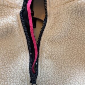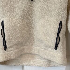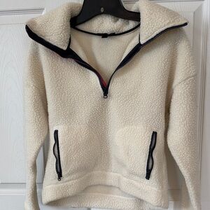 Womens J Crew Cream colored Soft sherpa fleece 1/4 zip jacket with stylish black details. Size XXS. Jacket has zippered side pockets. Ideal for warmth and comfort. VGUC. No rips or stains. Smoke Free household