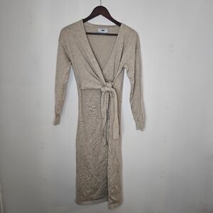 Stylish beige knit wrap dress with long sleeves and tie waist. Neutral oatmeal brown / tan color perfect for casual wear, business casual, parties, date night and so much more. Minimalist vibes.
