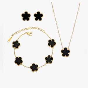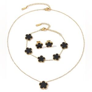 Elevate your style with this chic black and gold floral necklace set. Perfect for any occasion, this set adds a touch of sophistication to your look.