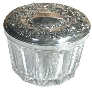Vintage Towle sterling silver and glass vanity jar, can be used as a powder or trinket box. Glass jar has a paneled design, and the sterling silver lid has a gorgeous repoussé floral pattern.