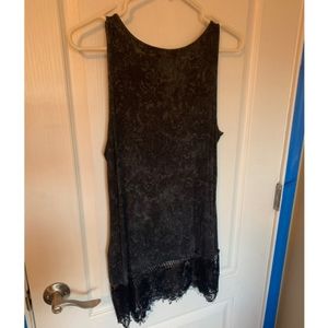 Grey with black paisley type print. Black criss cross chest area, black lace bottom. Size Large.