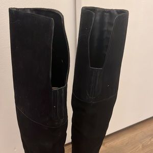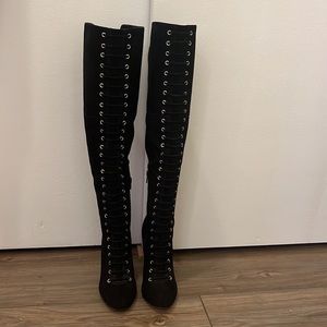 Stylish black lace-up boots. Knee-high design. Chunky heel for comfort.