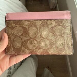 Vintage Elegant Coach wallet with a pink flap and tan body. Ideal for organizing essentials. Has purple interior.