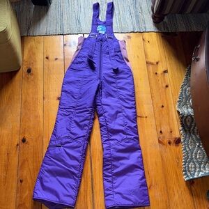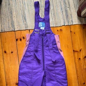 Vibrant purple snow bib overalls with adjustable straps. Perfect for winter activities.