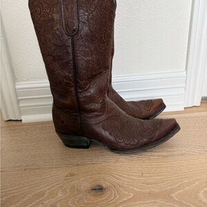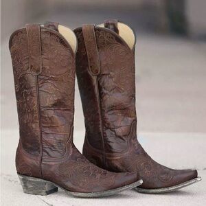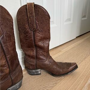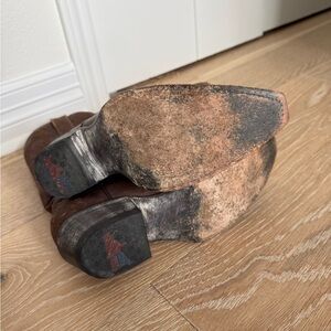 Stylish distressed leather boots with intricate patterns. Perfect for a Western look. Preowned with normal wear. See pictures and let me know if you have any questions.